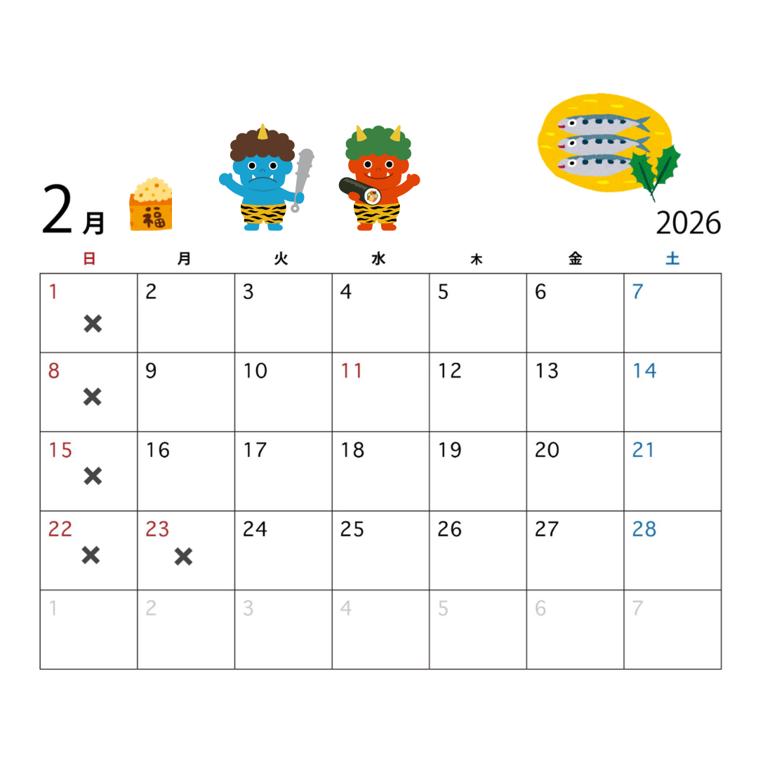 【2月の営業日のお知らせ】未分類2026.01.26* こんにちわひぐらし鍼灸院です 【2月の営業日のお知らせ】 2月は日曜日のほか23日(月)がお休みになります🎌 寒い日が続きますが身体を冷やさないように暖かくしてお過ごし下さい 2月もどうぞ宜しくお願い致します ひぐらし鍼灸院*岡